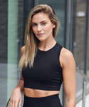 Women’s cropped tank. Seamless fabric. Single-layer front. Self-fabric binding around neck and armhole. Ribbed hem.